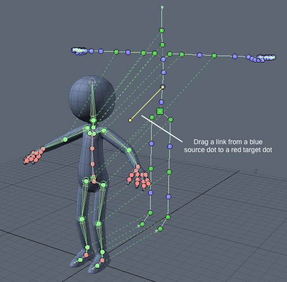 重定位链接在映射的关节之间以虚线绘制。目标骨骼上已映射关节的线框颜色更改为绿色,以表明该关节当前是由重新定向驱动的,即使关闭了“重新定向”工具也是如此。一旦从骨骼中删除了重新定向,关节的原始颜色就会恢复。通过单击并将其从蓝色源连接手柄拖到红色目标手柄中,可以添加新链接。链接可以通过以下方式删除Ctrl+单击源或目标连接句柄。