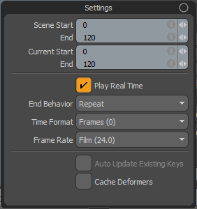 一次在时间轴上播放一帧,以变形器和网格操作产生的网格填充缓存。右键单击以显示Cache Deformers at Current Time选项。 注意: 您可以在Animation Settings。要打开设置,请单击Settings时间轴中的按钮,或在菜单栏中,导航到Animate > Settings。 |