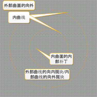 当使用一个环在另一个环中创建压纹时,曲线的方向对于指定向外和向内斑块很重要。当两个曲线沿相同方向绘制时,外部曲线的内部区域是内部曲线的外部区域。这样会产生意想不到的压纹效果。
