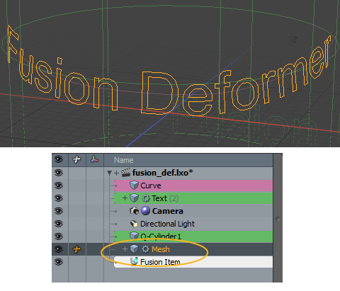文本网格物体在“项目列表”中被标记为“主要”网格物体,但3D视口中尚未发生任何事情。 - 选择融合项,然后在其Properties,启用 Fusion Deformer。