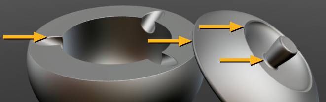 您可能会在原始图像中注意到某些边缘轮廓已被倒圆。烟灰缸主体上的凹槽周围的边缘已加宽,盖子上的凹槽周围的边缘以及盖子的边缘也已加宽。另外,盖子手柄的底部已倒圆角,以使与盖子的连接更加顺畅。下图指出了这些。