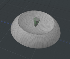| 6. | 要在盖子上压痕,我们减去一个球体:添加一个Q-Sphere,放置和调整大小,使其与盖子的上半部分重叠。当您对新的尺寸和位置感到满意时,请与球体一起选择并修剪球体盖的顶部,然后单击Apply Subtractive Trim |