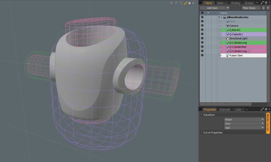 注意: 您可以在中调整线框的不透明度Defaults Preferences,在Procedural Modeling > MeshFusion > MeshFusion Wire Opacity。有关更多信息,请参见程序建模。