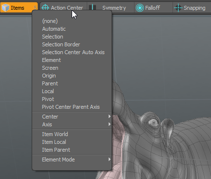 动作中心是可定义的原点位置,用于建模和转换动作Modo。虽然其他3D软件程序使用固定的网格几何体枢轴点作为大多数动作的中心, Modo将Action Center分成一个独立的动态可定义组件。这提供了一种轻松更改任何工具动作来源位置的方法。您可以在Action Center下拉菜单,或者在菜单栏中Edit > Action Center。您还可以将动作中心进一步分为其中心和轴部分,以实现更好的控制。