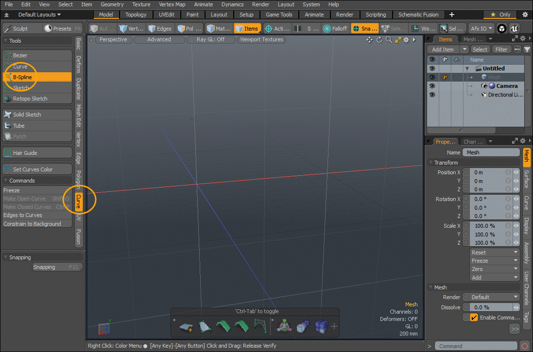 在此示例中,我们添加了Curve和Mesh项到我们的场景,它们在Mesh Ops清单。的Mesh项目用于沿着由创建的曲线创建轮廓B-Spline Extrude工具。