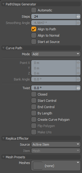 仅在Automatic选项已禁用。定义的Steps值确定沿曲线路径生成并馈入粒子的粒子数。 Effector,基本上控制克隆的数量。 |