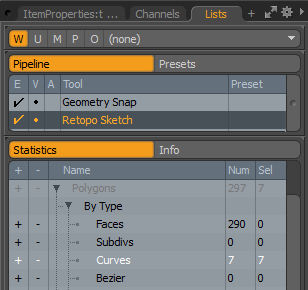 小费: 选择集将自动创建。要查看此选择集,请在Mesh Operations清单,在Statistics子标签,展开Polygons > By Selection Set。根据您应用的方法, RetopoEdgeLock要么RetopoFlow列出了各自的曲线计数。