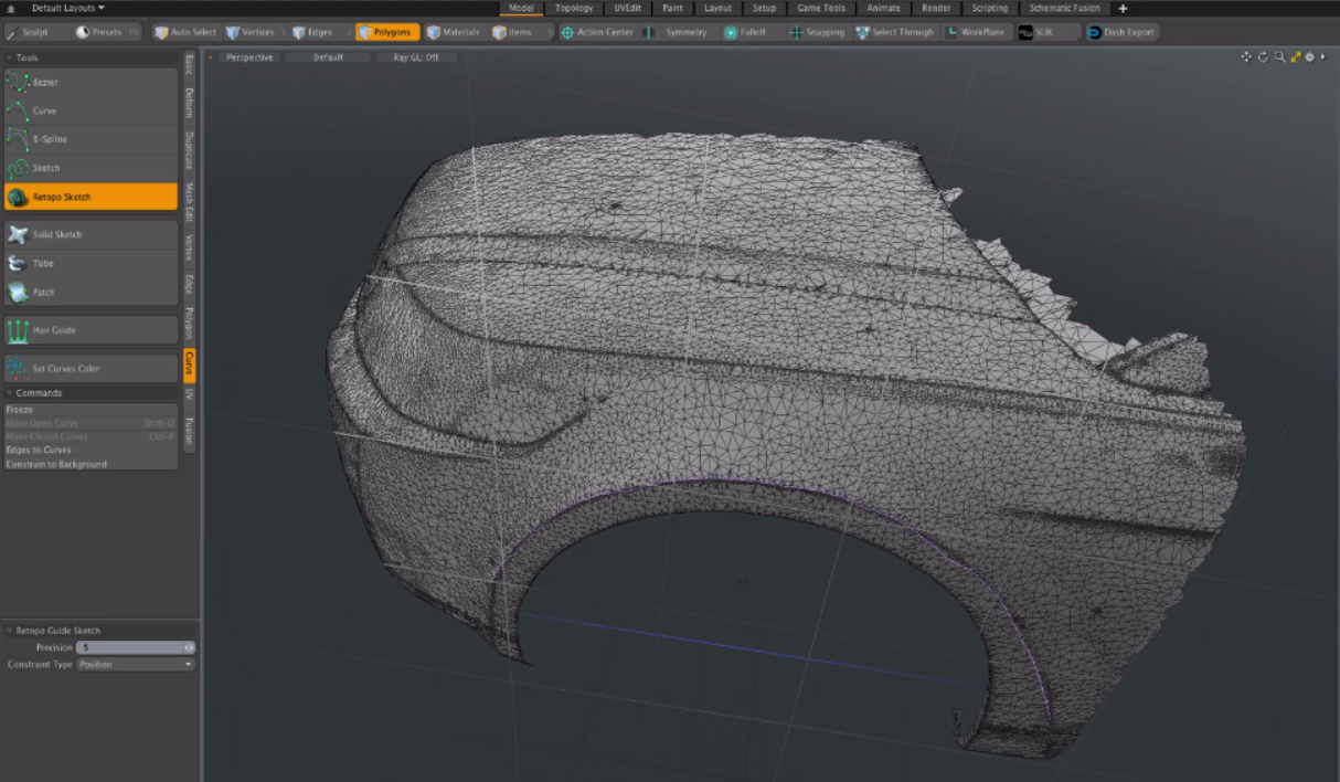 的Retopo Guides工具可让您在曲面上绘制曲线(折线),并将其设置为Automatic Retopology。这些曲线标记有特殊选择集名称, autoretopo命令查找,并且它们具有顶点法线贴图,其中法线从选定曲面中获取。由于放置Retopo Guides在您的网格上,曲面上的曲线多边形会创建一个多边形选择集,从而改善到曲线和选定网格的自然方向的对齐流。