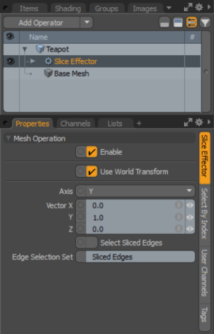 定义边缘选择集的名称Select Sliced Edges选项。您可以在Add Operator > Mesh Operations > Selection > Select By Selection Set可以与Edge网格操作一起使用。 |