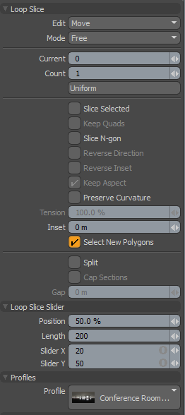 定义如何Modo创建和定位切片: Free允许沿着指示栏的任何位置, Uniform在循环中均匀地间隔切片,并且Symmetry在50%的位置镜像循环切片。 |