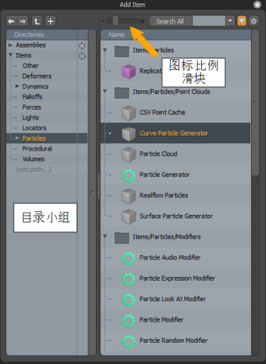 “预设浏览器”是您用于过程建模的选项板,可以在此处找到所有具有等同过程的工具。这些工具根据类型按目录分组。您可以使用Directories面板在左侧。您可以使用比例滑块更改图标的大小。类别标题具有文件夹图标,工具具有其各自的图标。