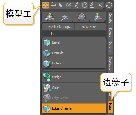 | 3. | 请点击Edge Chamfer,然后在视口中单击以激活该工具。 |