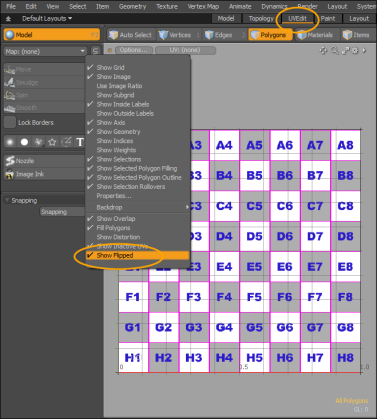 | 7. | 切换Enable选项以黄色显示的“ UV”视口中查看翻转的UV。 |
