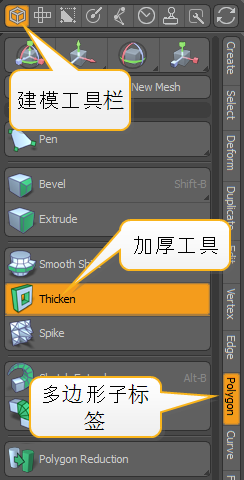| 2. | 下Mesh Operations > Polygon,双击Thicken。 |