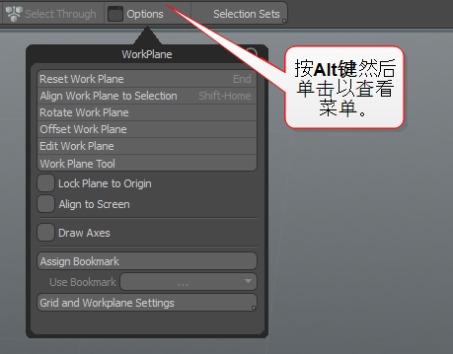 通过按来显示工作平面的控件Alt + Work Plane,或点击Edit > Work Plane。您也可以使用Home键,可将工作平面动态定位到鼠标指针正下方的任何几何图形,并以指针尖端与多边形表面相交的位置为中心,并将其与多边形的法线方向对齐。