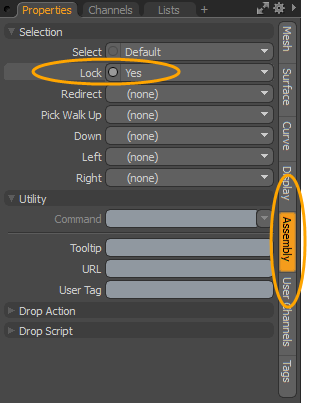 • 或者,在Properties所选网格项目的标签,打开Assembly标签,并设置Lock至Yes。有关更多信息,请参见装配视口。