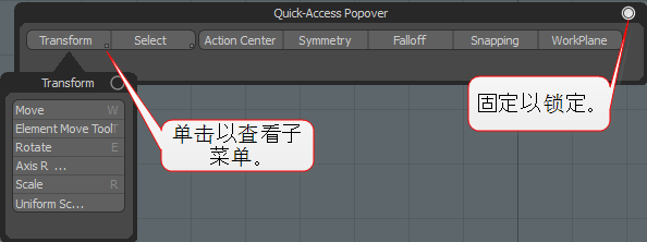 您也可以通过单击窗口右上角的小圆圈,在UI中固定弹出窗口。要关闭窗口,请再次单击图钉。固定弹出窗口在Modo会议。