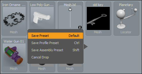 • 预设文件菜单 -选择场景中的项目,然后单击以下选项之一: File > Save Item Preset..., File >Save Assembly Preset..., 要么File >Save Environment Preset...