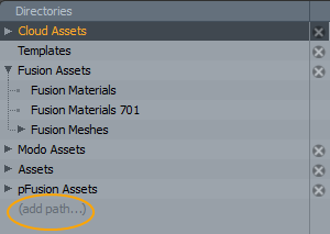 小费: 要使新的预设自动显示在“预设浏览器”中,请使用存储预设的目录并将其保存在该目录中。这通常是在Luxology\Content\Assets. 您也可以创建一个用于保存预设的新目录。在目录列表上,单击(add path),导航到适当的目录,然后单击Select Folder。预设浏览器在导航树的底部显示该文件夹的名称。