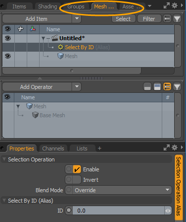 | 1. | 在右侧面板上,打开适当的视口选项卡。例如打开Items, Shading , Mesh Ops要么Groups。 |