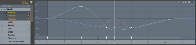 图形区域是实际值的操作区域。在此图中,从左到右始终代表时间,但是上下变化取决于所选的通道类型。连接各个关键帧的线表示该值随时间的变化。默认, Modo使用平滑曲线在关键帧值之间进行插值,以提供良好的缓入/缓出效果。有时您可能需要非常不同的插值样式,或者只是想应用更好的控制。只能通过操纵关键帧来更改动画曲线,这与在建模视口中使用Bezier曲线非常相似。关键帧沿线表示为微小的小方块。