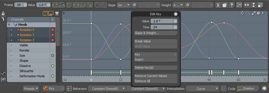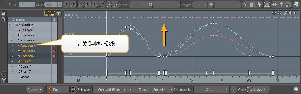 插值控制在用户定义的关键帧之间计算所有值的方式,并且可以作为修改所有Slope和Weight自动为所有键设置值。