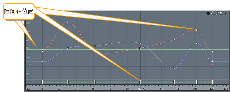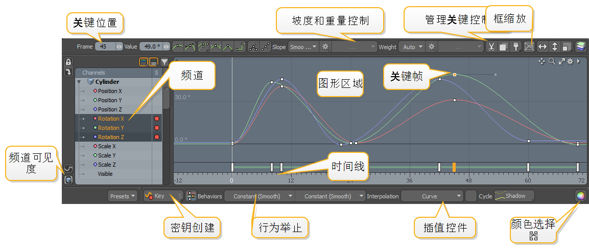 底部的时间轴在功能上与时间线在里面Animation布局。单击并拖动可更改当前时间。拖动当前时间值时,可以在3D视口中看到动画曲线的效果。柄出现在时间线中出现关键帧的任何位置,您可以在时间上向前或向后单击并拖动它们,从而修改选定通道的关键帧的位置。