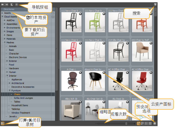 预设浏览器也位于Layout视图。在主菜单下,点击Layout标签,然后在视图底部,打开Items标签,然后展开Cloud Assets