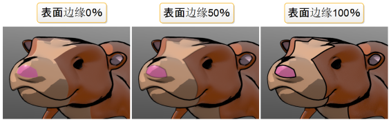 该值指定与附近的材质组叠加的cel边缘的百分比。以下图片显示Surface Edges调成0%, 50%和100%分别。