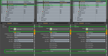 然后,您可以将相同的纹理连接到不同的着色器效果,并使用通道旋转来输出正确的通道。下图显示了从单个纹理到多个着色器效果的通道扭曲。