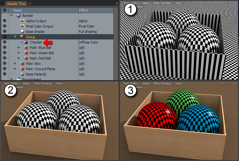 在下面的示例中,有三个彩色球体,一个盒子和一个地平面。在里面Shader Tree,您会看到三个有色球体被分组为一个未定义的Material Group。在父组的正下方,添加了一个棋盘格纹理(红色箭头旁边)。由于它位于树中所有其他层之上,并且其上的组是未定义的,因此会影响整个场景,如示例一所示。