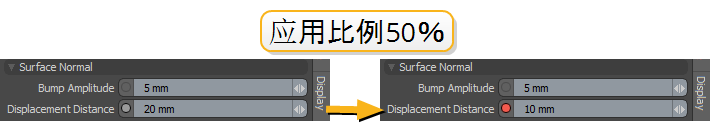 要将比例值烘焙到材料的选定属性中,请单击Apply Scale。这将修改材料上的值。例如,缩放Displacement Distance减半到材料的50% Displacement Distance值。