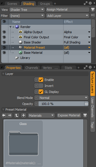 “材质预设”是“着色器树”中的一层,它引用“预设浏览器”中的材质预设,并允许您轻松更改项目上的材质。