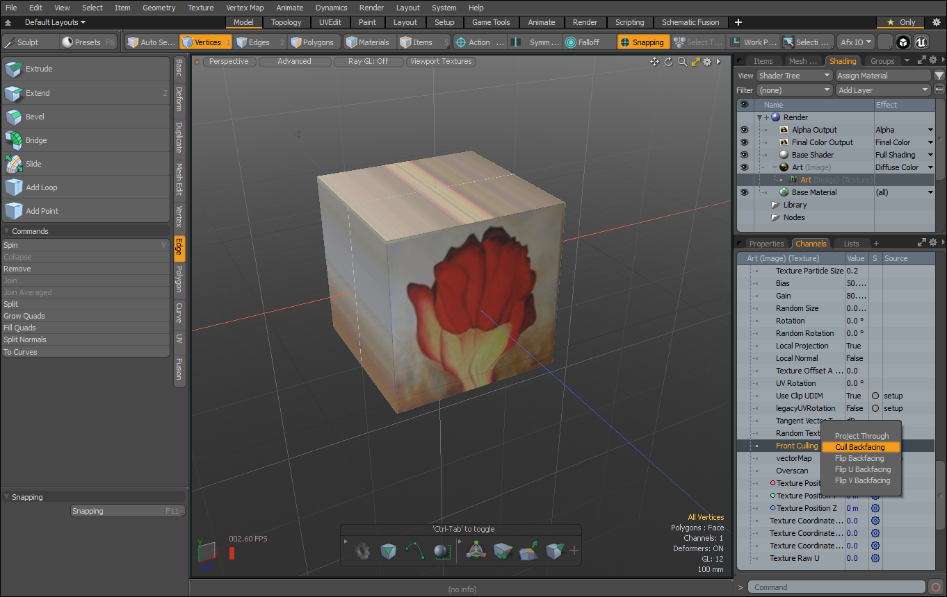 小费: 您可以设置投影映射的类型Front Culling中的选项Channels标签。打开Shading标签,选择您添加的项目图像,然后单击Value领域Front Culling。提供以下选项:![]()