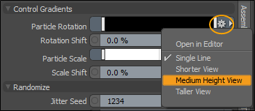Particle Rotation | 设置粒子沿曲线旋转的变化(通过Forward Axis),通过调整Rotation Gradient渠道。水平轴代表曲线的全长。的Particle Rotation可以使用五个界面选项之一进行设置。单击左侧的小三角形以选择五个界面选项之一: • Open in Editor -打开渐变编辑器。 • Single Line -显示使用灰度渐变表示旋转量的线视图。黑色表示0%,白色表示100%。您可以通过在行上单击鼠标中键来添加控制点。要设置控制点的值,请双击控制点以打开Set Key Value对话框,然后编辑Value设置。 • Shorter View -显示渐变的小图表示。您可以拖动控制点并添加新的控制点,就像在渐变编辑器。 • Medium Height View -显示与Shorter View但具有更大的垂直空间。 • Taller View -显示最高的图形视图。 |