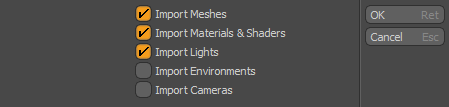 默认, Import Meshes, Import Materials & Shaders和Import Lights已启用。
