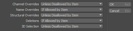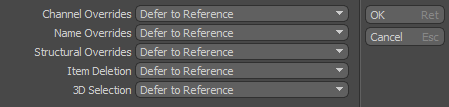 后两个设置直接在项目上定义,无论是在其源场景中还是在主场景中作为参考项目。通过选择要控制的目标元素,然后选择菜单栏命令来分配它Items > References > Item Override Settings,这将打开Item Override Settings对话框。