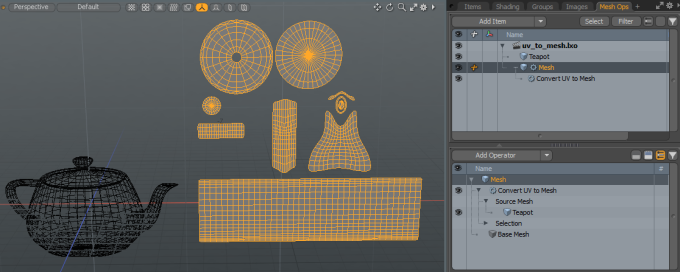 | 2. | 在顶部的“项目列表”中选择新的网格层。 Mesh Ops标签并点击Add Operator。下Mesh Operations > UV,双击Convert UV to Mesh。 |