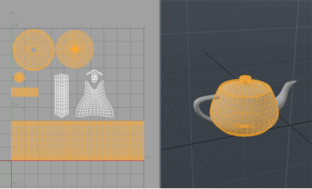 默认茶壶图元的UV贴图。选择连续的多边形实体,并显示匹配的UV岛。您可以看到它们的拓扑结构不同。 |