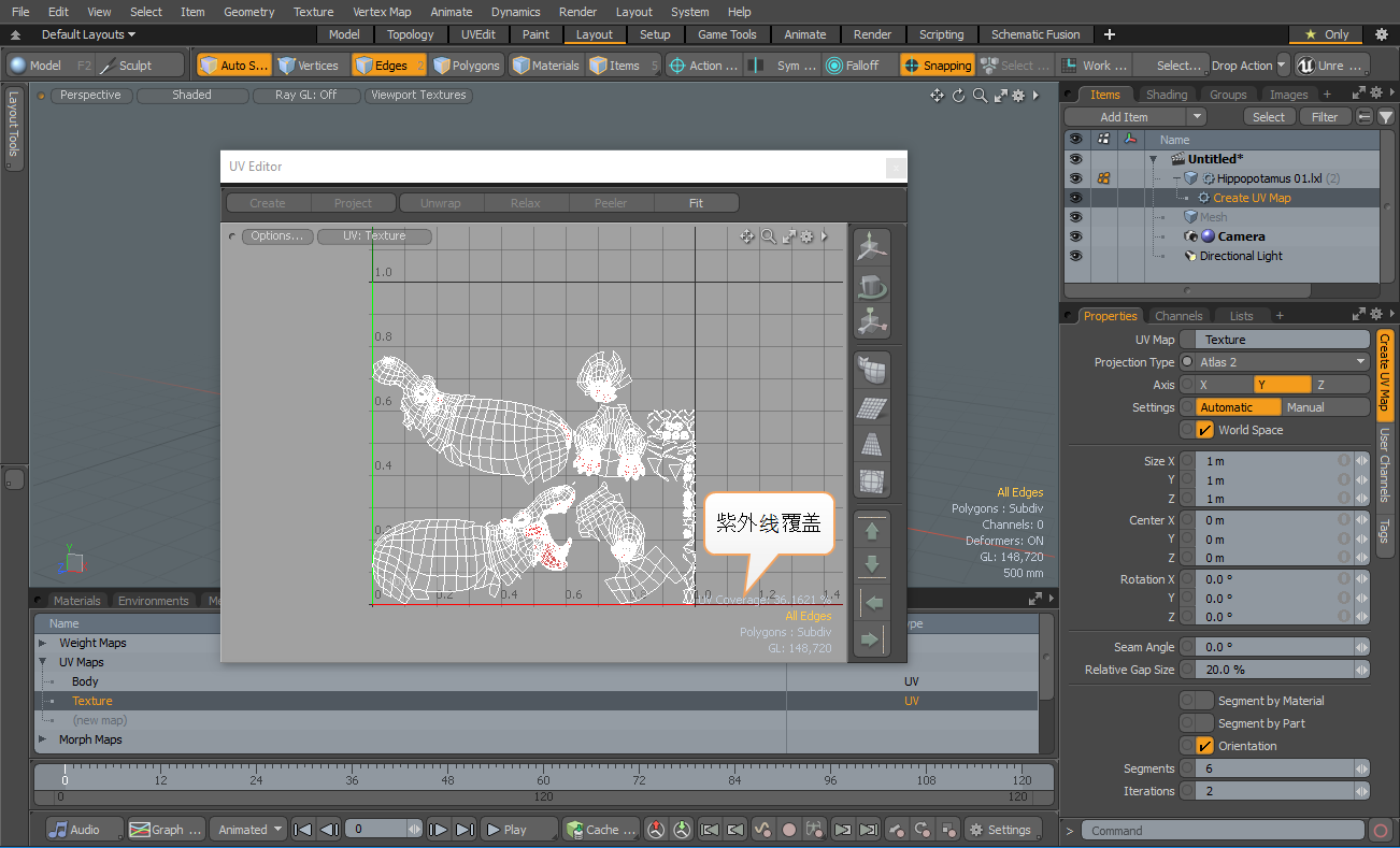Hippopotamus 01网格显示并更新UV Editor。