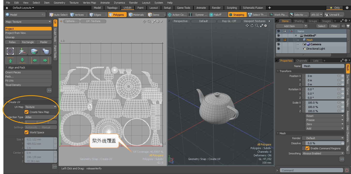 Modo生成UV贴图,该贴图显示在“ UV纹理”视图中。在左窗格的“工具箱”中, Create UV显示选项。