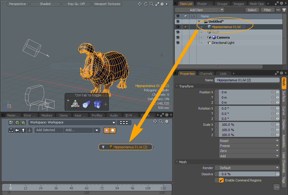 | 2. | 按Fn + F6在键盘上打开“预设”,展开Assets > Meshes > Animals,然后双击Hippopotamus 01。 |