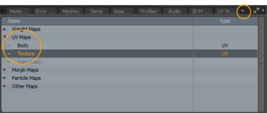 | 8. | 在“顶点贴图列表”视口中,单击UV Maps然后双击Texture。 |