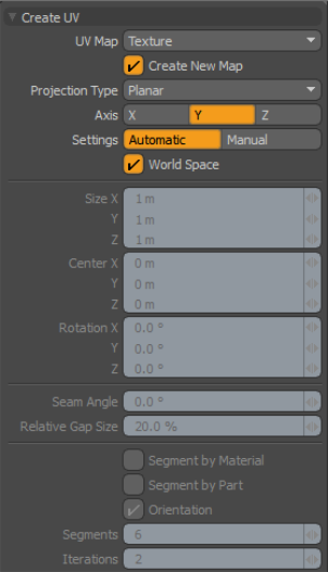 指定如何Modo缩放UV投影。 Automatic -设置UV投影的比例,以根据所选网格物体的边界框最佳地填充总可用UV空间。 Manual -使用Size, Center和Rotation设置以定义影响最终UV贴图的整体大小的特定投影。 |