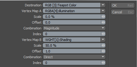 您可以使用此工具制作变形大小的权重图,在权重和UV之间移动,反转vmap等。目标地图也可以是源地图。如果不指定a,则值为0,但是Modo将偏移值和比例值应用于恒定值项以使其可用。