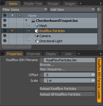 用户可以通过单击添加RealFlow粒子项目。 Add Item的按钮Item List。下Particles,双击RealFlow Particles。添加后,您可以指定.bin文件的名称和位置,使用Browse在项目属性面板中找到的选项。但是请注意,RealFlow .bin文件未在内部保存到Modo场景和外部文件需要与加载时保持在相同的相对位置,以便正确渲染。