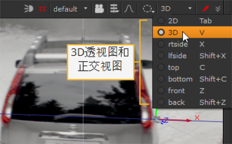 当脚本中具有3D设置时,任何“查看器”窗口都可以在2D和3D显示模式之间切换。2D模式显示渲染场景的结果,3D模式显示场景中摄像机的透视图。
