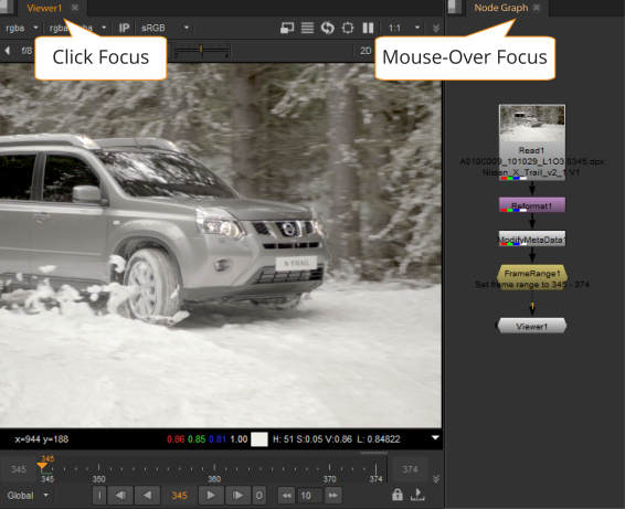 单击焦点与鼠标悬停焦点之间的一个很好的例子是在查看器和节点图之间: