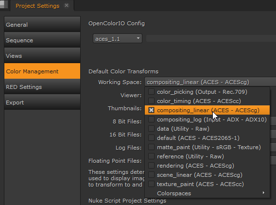| 5. | 现在,您可以从默认的LUT设置中选择您的角色。例如,您可以将工作空间设置为compositing_linear如果要在ACEScg色彩空间中工作。 |