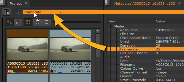 如果使用标签搜索项目无法有效过滤媒体,则可以搜索包含某些元数据的剪辑。例如,如果要查找具有特定分辨率或帧频的所有剪辑。